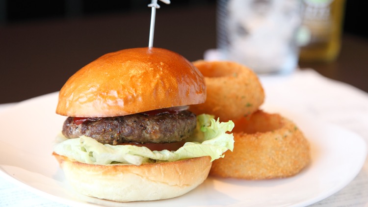 一番人気の「ダグズ・バーガー」(850円)。オニオンリングスとドリンクとのセットはプラス700円で提供。