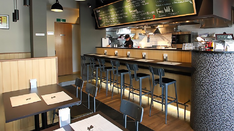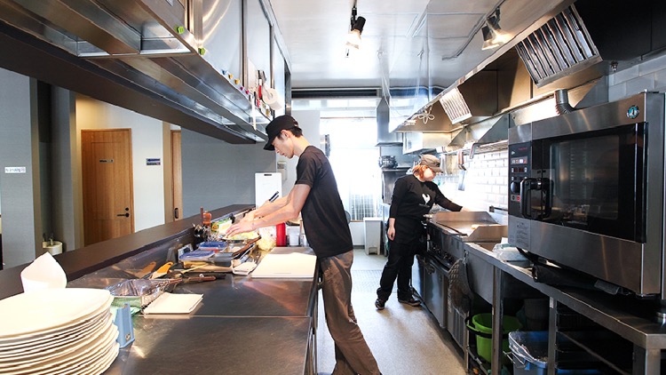 このお店を出すにあたって本社(東京)で試作や試食を重ねた結果、やはりスチコンが必要だという結論に至りました。東京のホシザキさんのテストキッチンを利用してハンバーガーのレシピを完成させて、そのレシピを作るための厨房を作ってくださいとオーダーしました。だから、スチコンでハンバーガーを作るのが前提の厨房設計ですね。調理に使うのは、鉄板とスチコンとフライヤーだけ。実にシンプルな厨房です。