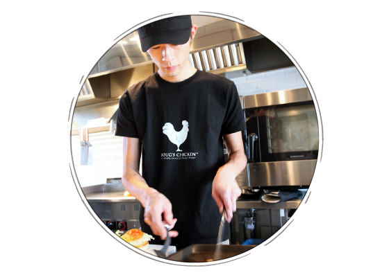 ほぼ、パテを焼くための専用機になっています。お店のメインがハンバーガーなので、忙しい時間帯はほかのことに使う余裕がないくらいなんですね。夏場になると1日で150枚くらい焼く日もあるので、オーダーごとにモード設定をするという使い方にせず、一日中コンビモード230℃の水蒸気100%で運転して、調理時間は手元のキッチンタイマーで管理しています。ハンバーガー以外だと、クリスマスイブ用のローストチキンの調理にも使用します。今日、僕が着ているのが、その「ダグズ・チキン」のTシャツなんです。この店は、牛肉も鶏肉も素材のよさを最高に引き出してくれるクックエブリオに頼りっぱなしです。