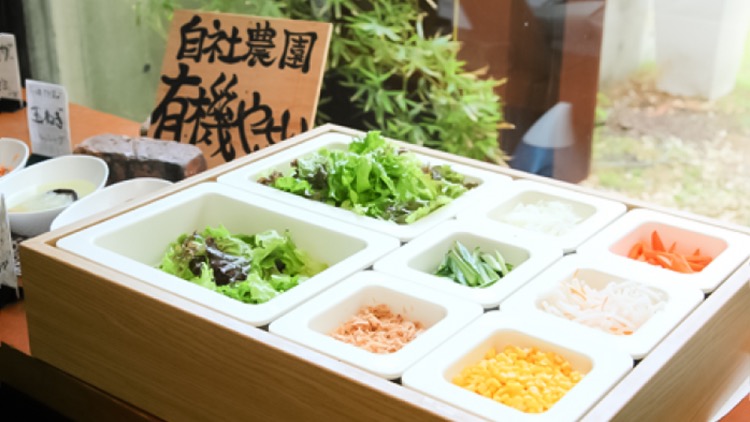 自社農園の有機野菜を使った自慢のサラダバー。野菜の種類は固定せず、その日に採れた新鮮なものを提供。