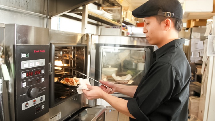 新海さん それに営業中は、つけっぱなしですね。オーダーから提供までの時間をできるだけ短くしたいので、予熱にかかる時間も省略したいと、ホシザキさんに相談してタイマーをめいっぱいに設定する方法を教えてもらいました。常に運転状態になるので調理の度に立ち上げなくていいし、予熱完了の音も鳴らないからうちの店にはすごくいい使い方なんですよ。
