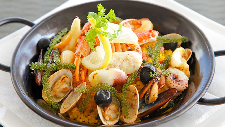海ぶどうがトッピングされた「沖縄パエリア(Small)」(1,380円)。仕上げの加熱にスチコンを使用。