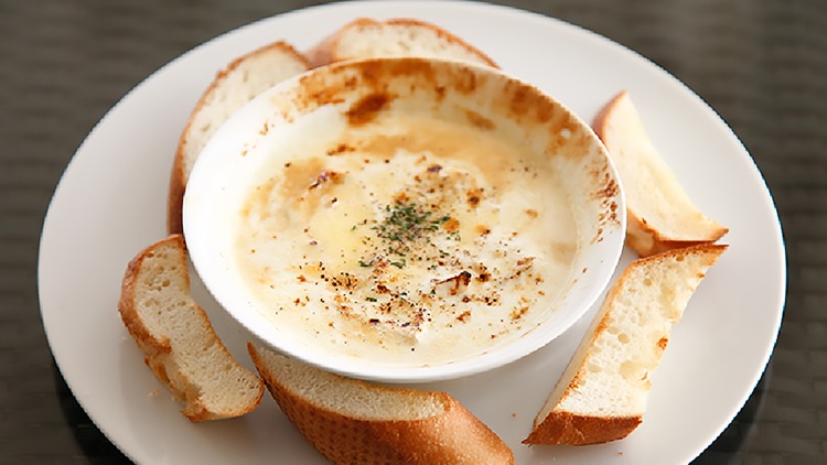 前上門さん 「アツアツ、トロトロのカマンベールチーズフォンデュ(バゲット付き)」です。ふんわりトロリと仕上がったチーズと、カリッとしたバゲットの相性がとても良い人気のメニューです。おいしさももちろんですが、スチコンを使っての一番のメリットは時間短縮。以前は焼き色をつけるためにパンをトースターで、チーズをオーブンでと別々に加熱していたんです。それがスチコンだと、1つのホテルパンにチーズの皿とバゲットを並べて入れるだけ。わずか2分で一度にできるようになりました。グループ3店舗で同じメニューを提供していますが、この店が一番早くお出しできると思います。