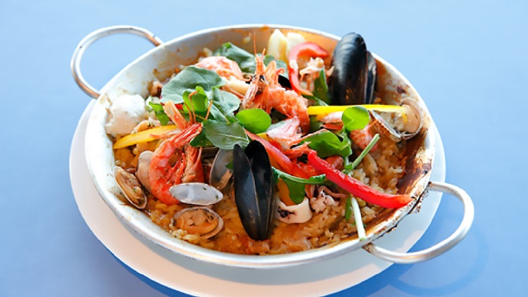 「魚介のパエリア」(2,200円)。絶妙な炊き上がりのライスに魚介の旨味がしみ込み、素材そのもののおいしさを堪能できる一品。