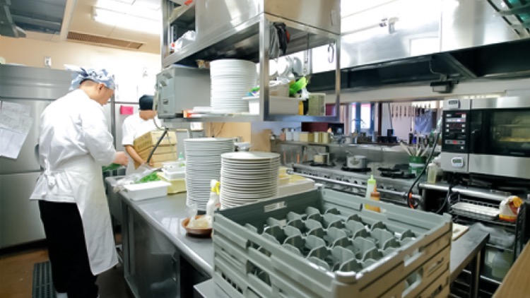 最大80席以上のオーダーに応える厨房。クックエブリオは大事な戦力となっている。