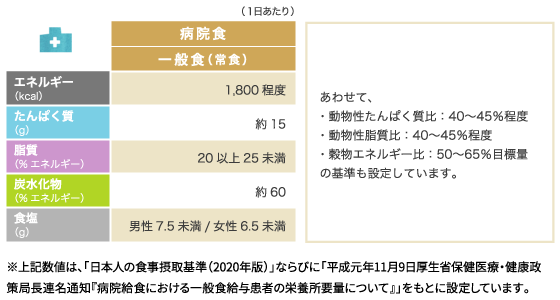 病院食は、入院患者さん個々に算定された医師の「食事箋」に基づいた栄養補給量を用いることが原則とされるため、病院ごとに目安量が異なります。ここでは、「きっちんぷらす」で使用している病院食、一般食(常食)の目安を紹介いたします。