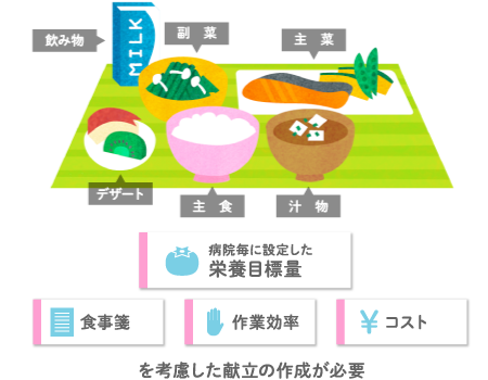 算出した給与栄養目標量を「食品群別荷重平均栄養成分表」を使って食品群別の食材使用量に置き換え「食品構成表」を作成。これをもとに主食量を決定し、決められた栄養目標量に適合するように、主菜/副菜/汁物などを組み合わせます。献立作成時は栄養目標量だけでなく、入院患者個々に算定された医師の「食事箋」を守り、さらに作業効率やコストを意識する必要があります。