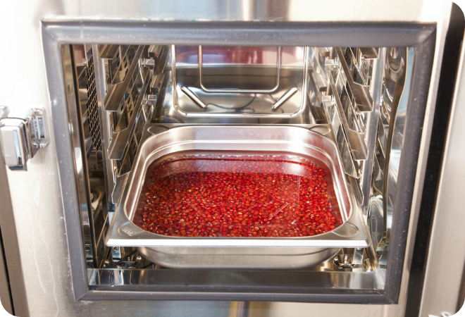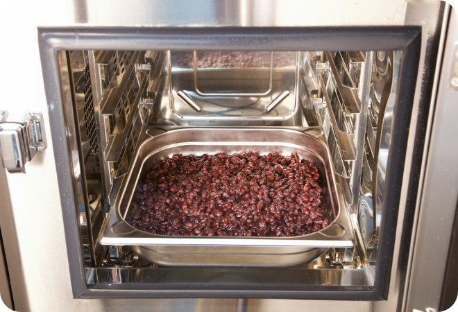 スチコンをコンビ・130℃・50〜60分間・水蒸気量40%に設定をして、予熱ボタンを押します。予熱完了後、(9)のホテルパンを入れて、スタートボタンを押して、加熱します。