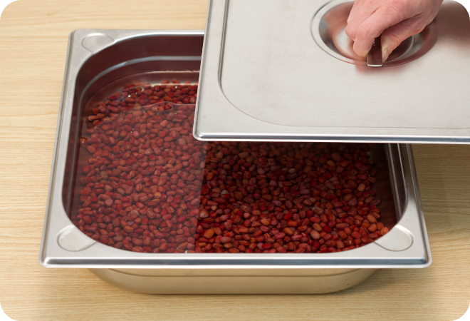 二度の渋切りを終えた小豆をホテルパンに戻し入れ、水1500ccを注ぎ、ホテルパンに蓋をします。