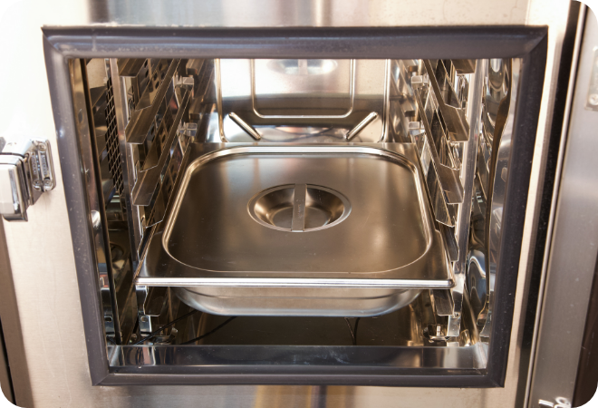 スチコンをスチーム・130℃ 10分間に設定して、予熱ボタンを押します。予熱完了後、(1)のホテルパンを入れて、スタートボタンを押して、加熱します。