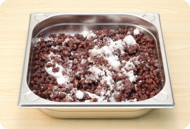 本茹で後、しっかりと水気を切った小豆に砂糖をあわせ、残った水分を飛ばす目的で行います。