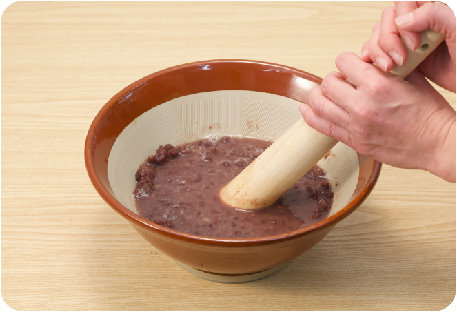 加熱完了後、ホテルパンを取り出し、小豆をすり鉢に移して水を足しながらすりつぶし、ボールで受けながらザルでこします。網に残った小豆の皮は捨てます。