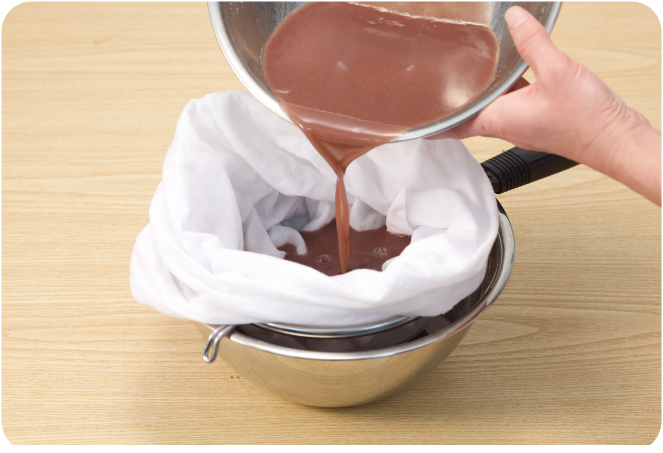 (7)のこし汁を2重にしたこし袋で布ごしし、しっかり水気を絞って「さらしあん」を取り出します。