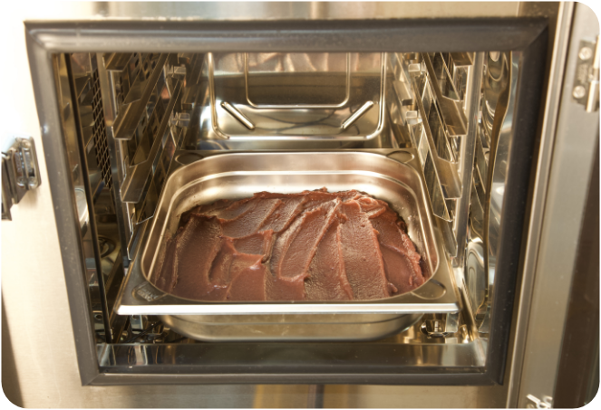 スチコンをコンビ・130℃・50〜60分間・水蒸気量40%に設定をして、予熱ボタンを押します。予熱完了後、(9)のホテルパンを入れて、スタートボタンを押して、加熱します。