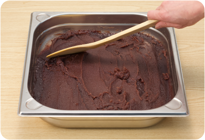 柔らかくしたい場合は水を加えながら加熱。硬くしたい場合は、そのまま加熱して水分を飛ばします。いずれも口の広い鍋を使って、あんを混ぜながら行います。