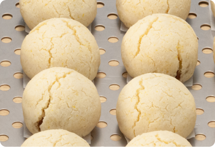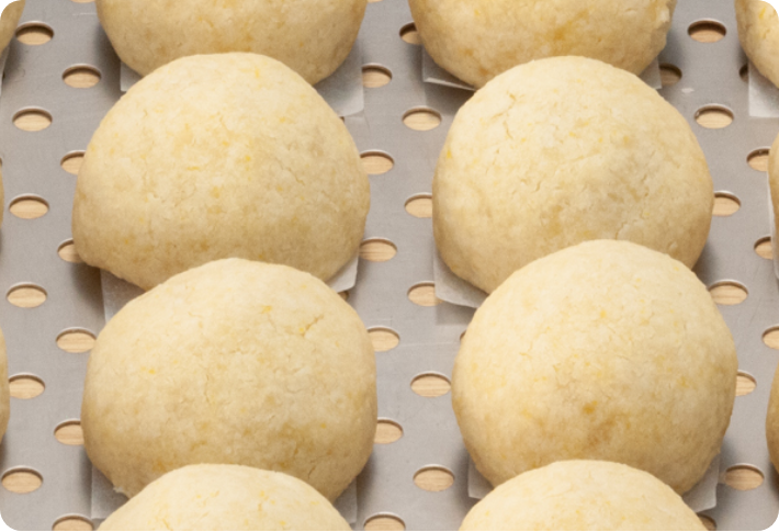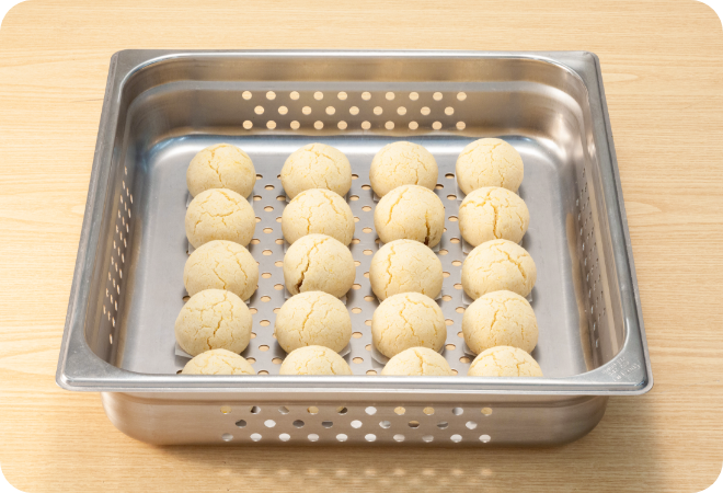 黄味しぐれの特徴である「キレイな割れ」を作るには、外側の生地の厚みをある程度持たせること、そして生地の水分をほどよく飛ばすことがカギとなります。スチコンのスチームモードを使えば、加熱中の温度も細かく設定ができるので、せいろなどに比べ、水分量のコントロールが比較的簡単にできると思います。