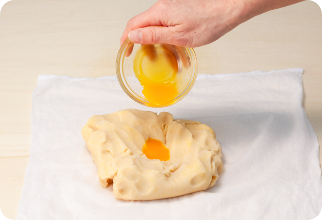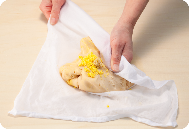 白こしあんとゆで卵の黄身を合わせ、濡らしたさらしを使って折りたたむようにして混ぜ合わせます。