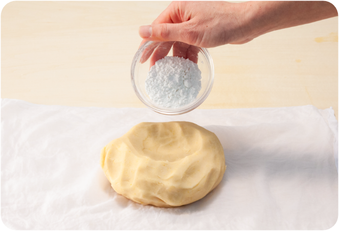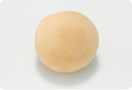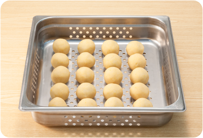 (3)の黄身あんに上用粉を加えて混ぜ合わせます。混ぜ終えたら、黄身あんの生地を20等分(1個25g)します。