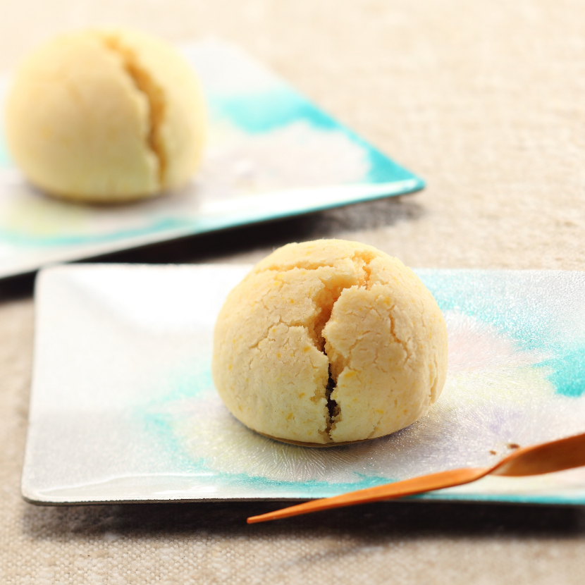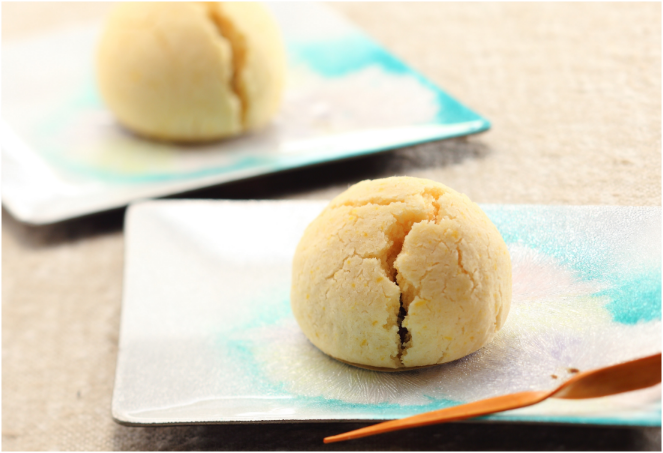 「黄味しぐれ」のいちばんの特徴は表面のひび割れ。黄色の生地は白あんと卵の黄身、上用粉を混ぜ合わせて作ります。「しぐれ」の名は秋の終わりから冬にかけて降る雨にちなんだもの。雨が降る景色や稲妻、雨の後に雲のすき間から日の光が差し込む様子などを表現したものと言われています。