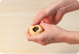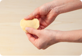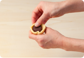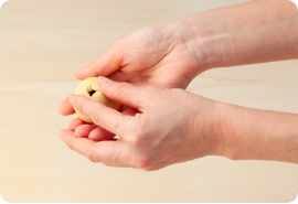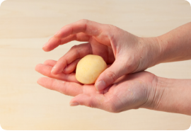 生地にあん玉をのせ、時計回りに回しながら、包んでいきます。