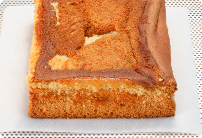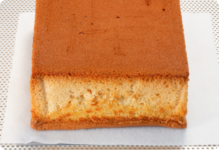 カステラは難易度が高い和菓子と言えます。大切なのは丁寧な「泡切り」。しっかり泡切りができていないと、焼き上がったときに中心部が膨らんでしまったり、割れてしまったりといった失敗につながります。また、カステラは加熱中にホテルパンを取り出して行う作業が多く、手間取ってしまうと加熱時間に影響を与えるため、手際よく行う必要があります。とはいえ、高温で加熱しているのでやけどにも注意が必要です。ホテルパンの出し入れ時などは、慎重に行うようにしてください。
