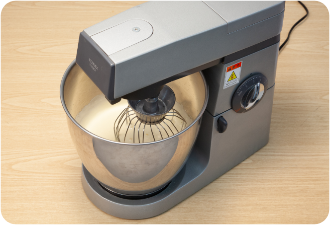 ボールに卵5個と卵黄1個分、砂糖を入れてミキサーの4速で2分撹拌し、さらに5速で3分撹拌します。