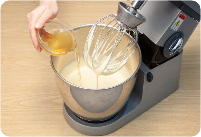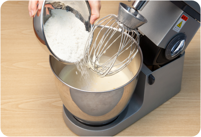 (2)のボールに薄力粉を入れ、3速で30〜40秒撹拌します。