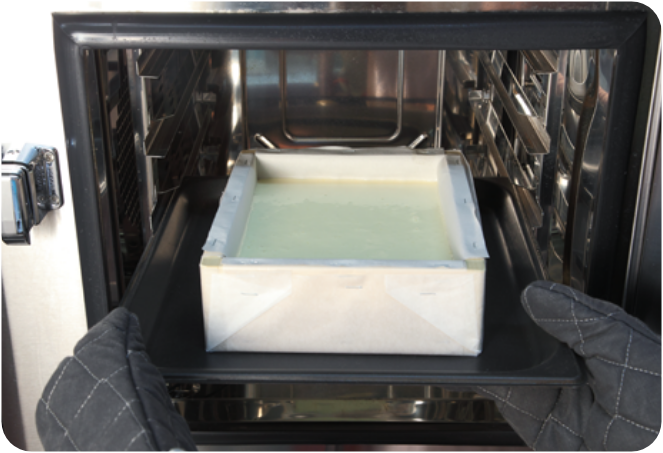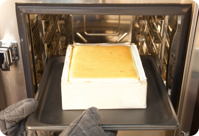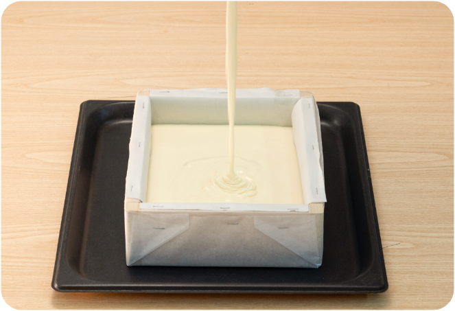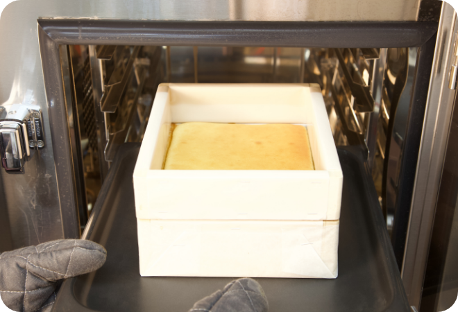 - ・カステラ用型枠を用意し外側の底と側面をオーブンシートで包み、型の内側にわら半紙を敷く