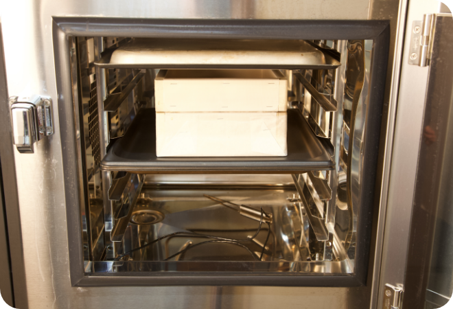 さらに10分後、ホテルパンを取り出し、新聞紙をのせたホテルパンを下に重ねてスチコンに戻し入れ、蓋用のホテルパンをひっくり返して、1段目にセットします。