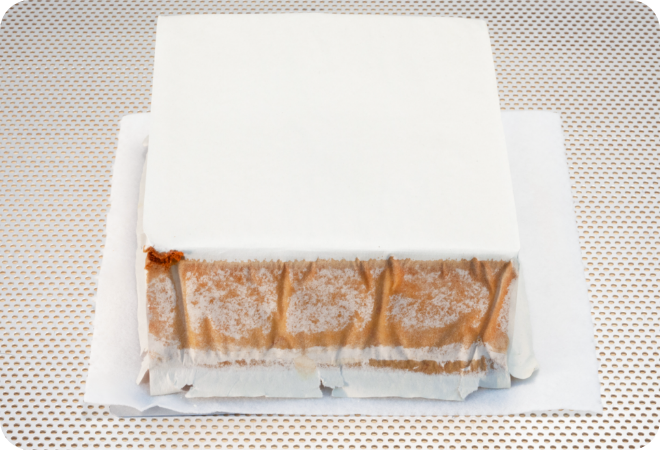 粗熱がとれたら、わら半紙をはがし、軽く重石をして完全に冷ました後、四辺を切り落とします。