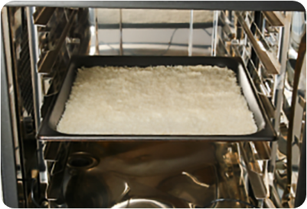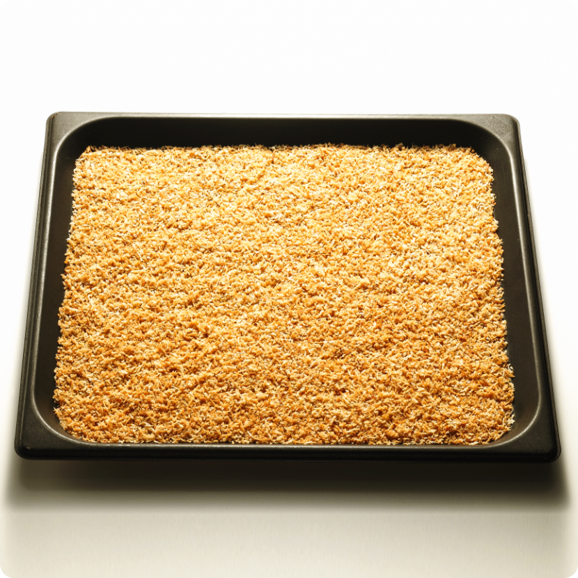 油を混ぜ合わせたパン粉をスチコンで加熱して、焼き目をつけます。