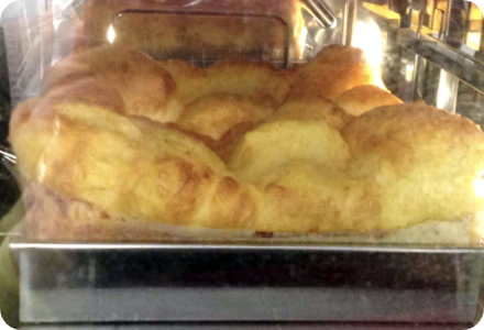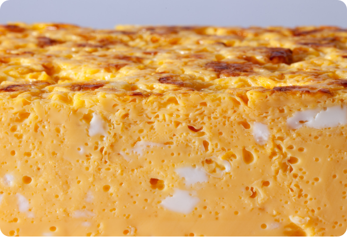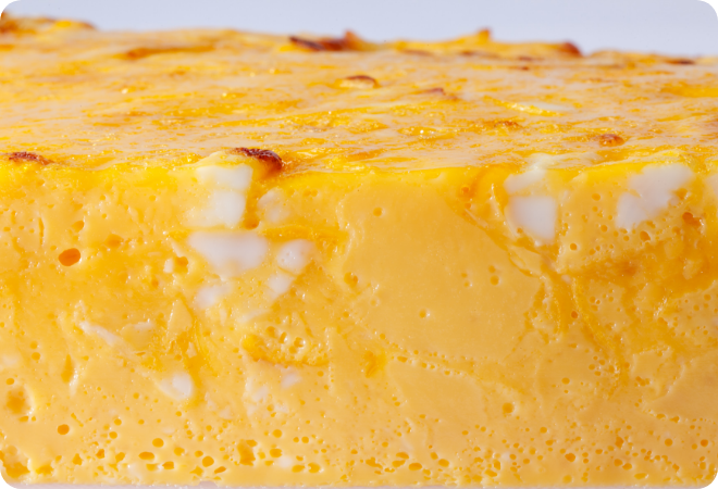 断面はツルンとしていて気泡がなく、密度が細かい。また、表面は膜が張って少し硬くなっている。食感は、焼きプリンや練り物に近い印象を受ける。