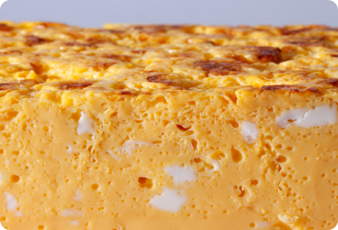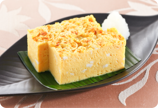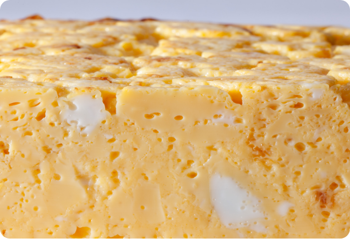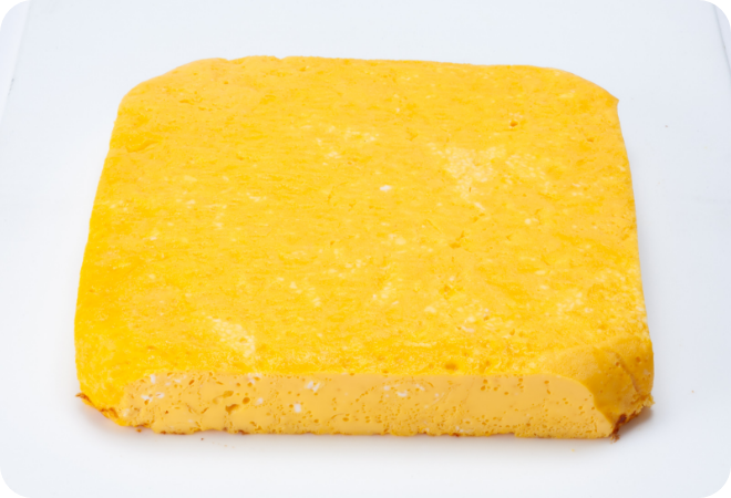 内部に小さな気泡が少し残り、全体的にふんわり仕上がっている。表面にはほどよい焼き色がつき、見た目・食感ともに卵焼きらしい仕上がりに。