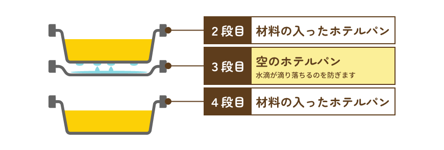 空のホテルパンは、加熱時に2段目のホテルパンに発生する水滴を