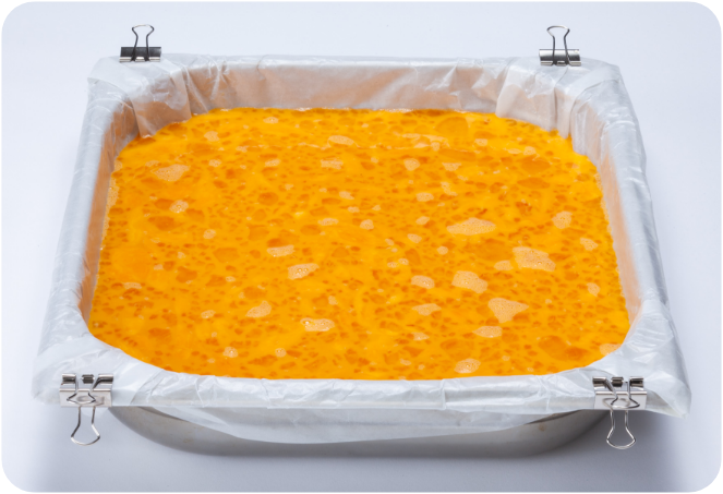 すべての材料を混ぜ合わせ、オーブンシートを敷いた65mmのホテルパンに流し入れます。