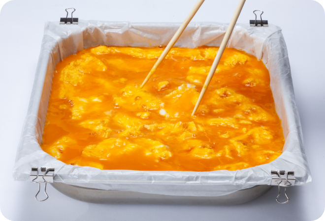 厚焼き卵をホテルパンから取り出す際はホテルパンが熱くなっており、また重いため、必ずミトン等を使用し、慎重にひっくり返してください。