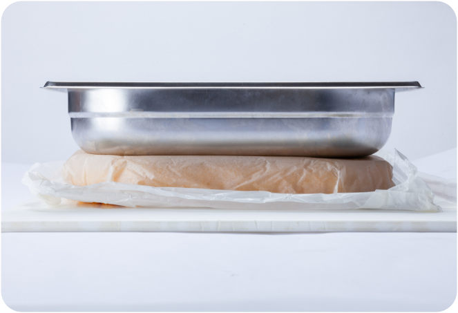 - ・65mmのホテルパンにオーブンシートを敷き、ずれないようにクリップ等で固定する。