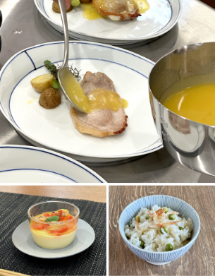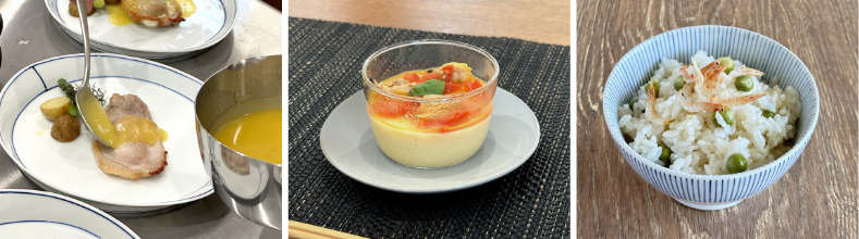 (写真左から)ローストポーク オレンジソース、トマトとあさりの茶碗蒸し、豆ごはん