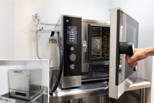 お店を開く際、どんな設備をおこうかと、知人で日本料理店を営む料理長に相談してみたんです。その時に、真っ先に上がったのがスチコンでした。うちは自習型の料理教室ではないので、デモンストレーションを行った後に、料理を提供するケースがあることが理由です。また調理モードや時間を設定してしまえば、私でも簡単に調理ができる点も魅力に感じました。オープン時には販売店の方の話を聞きながら、クックエブリオ ミニの他に、小形食器洗浄機やテーブル形冷蔵庫も一緒に導入しました。小形食器洗浄機はたった6分で洗えてとても便利ですよ。