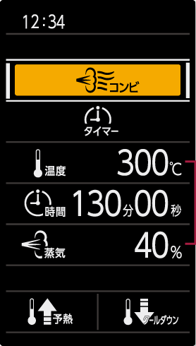 「温度/時間/蒸気量」現在の状態や設定値を表示します。設定欄の温度/時間/蒸気量は変更できます。