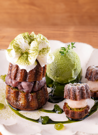 生地に抹茶を加えたカヌレに、抹茶ソースや抹茶アイス、あんこなどを組み合わせて和風にアレンジ。カヌレは半分にカットし、間にあんこを挟み込んでホイップクリームをトッピングして立体的に盛り付け。カフェにふさわしい華やかなデザートプレートに。