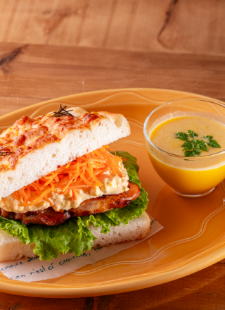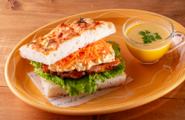 モチモチした食感で食べ応えもあるフォカッチャに、照り焼きチキンやキャロットラペを挟み込んだボリューム感のあるサンドイッチ。調理しておいた、かぼちゃのひんやりポタージュスープを添えて魅力をアップ。