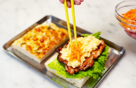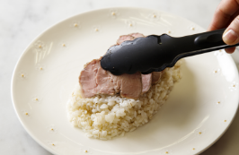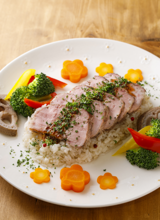 スチコンでジューシーにやわらかく焼き上げたローストポークを分厚くカットして、彩りのよい野菜といっしょにトッピング。ご飯にはモチモチした食感のもち麦を混ぜこみ、バターとパルミジャーノチーズで味付けました。
