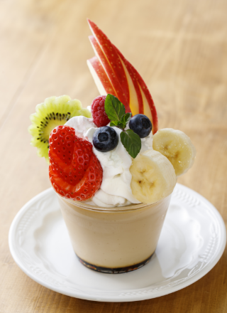 キンモクセイの香りを移したほうじ茶を使った、香り高い自家製プリン。旬のフルーツをたっぷりと乗せ、立体的に盛り付けて魅力的に。色々とトッピングできるように、プリン自体はやや固めに仕上げました。
