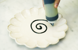 皿に抹茶ソースを中心から渦を巻くように描く。