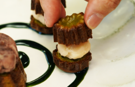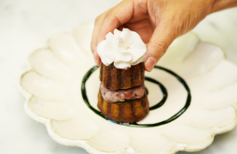 手前右側にはカヌレ(小)を置き、白あんをのせ、上の部分のカヌレ(小)をのせ、粉砂糖をかける。