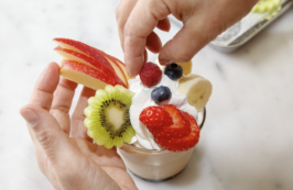 厚さ1cmに輪切りにしたバナナ・V字に切り込みを2か所入れたいちご・厚さ5mmにし花型に抜いたキウイフルーツ・くし切りにし切り込みを入れたりんご・ブルーベリー・ラズベリー・ミントを彩りよく飾る。