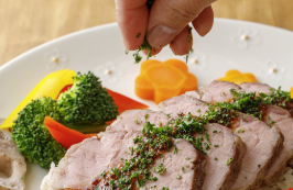 ローストポークの上に、ソースをかけ、パセリのみじん切りを散らす。