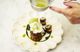 右奥に抹茶ゼリーを盛り、その上に抹茶アイスクリームをのせ、タイムで飾る。