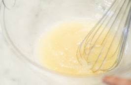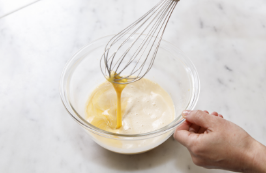 溶き卵・ラム酒の順に入れ、やさしく混ぜる。